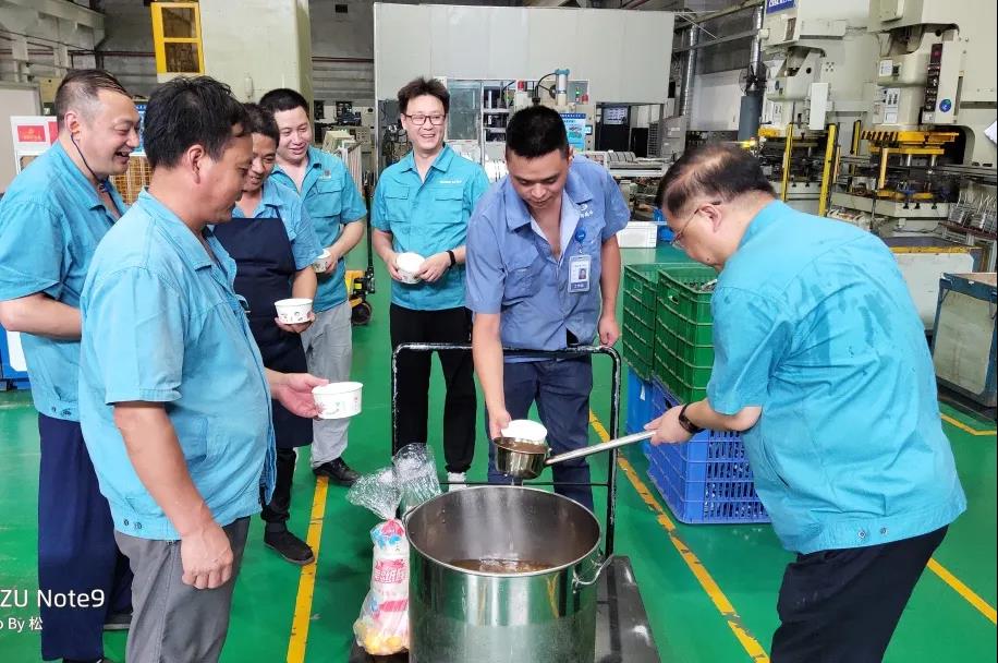 公司工會(huì)主席,監(jiān)事會(huì)主席譚萬江帶隊(duì)到車間生產(chǎn)一線,將一碗碗冰爽的綠豆湯送到職工手中,為他們帶去夏日的一絲清涼。